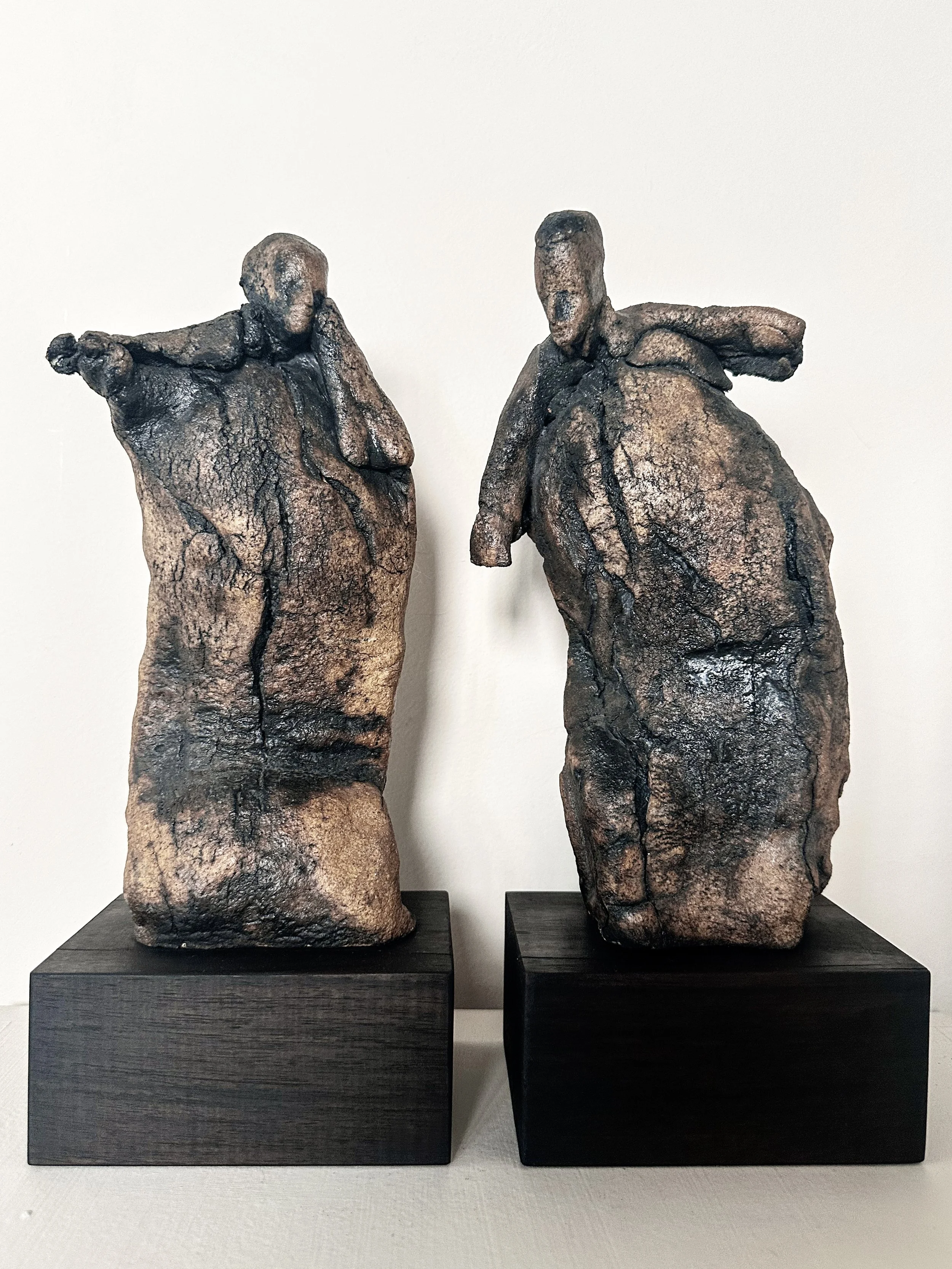 Vintage szobor pár, ismeretlen alkotó munkája, melyeket diófa talpra helyeztünk el. Rusztikus, durva felületű samott kerámia. Méretei: 33 x 13 cm